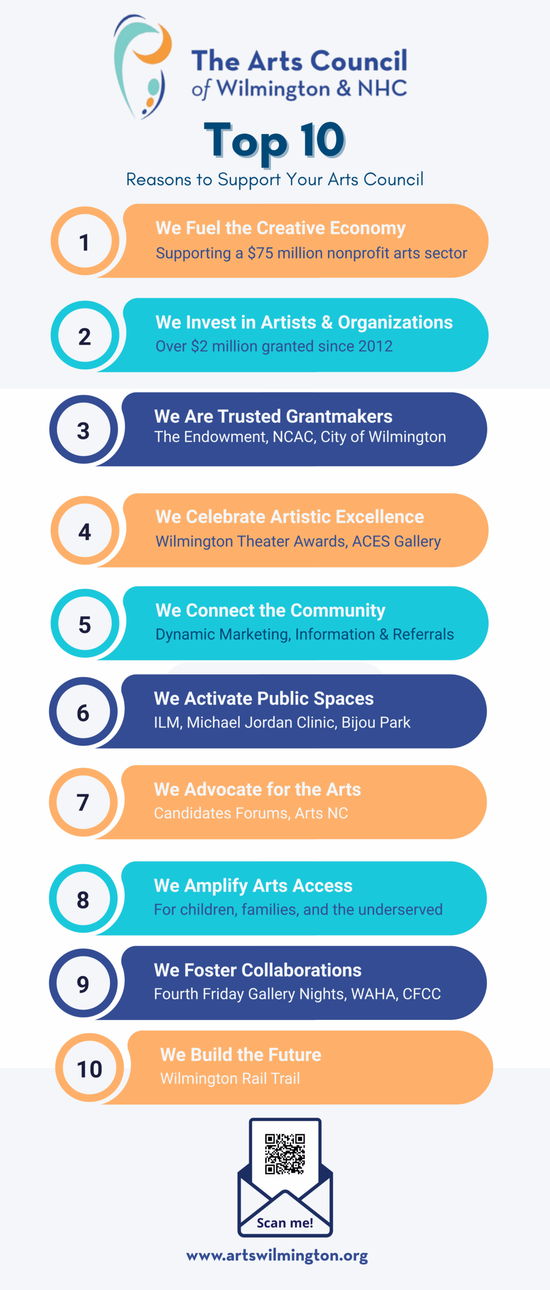 For more than a decade, the Arts Council of Wilmington & New Hanover County has served as a cornerstone of southeastern North Carolina’s cultural ecosystem. For the past 14 years, we have supported artists, arts organizations, and audiences through innovative public-private partnerships that create jobs, stimulate commerce, and elevate Wilmington as a vibrant arts destination.