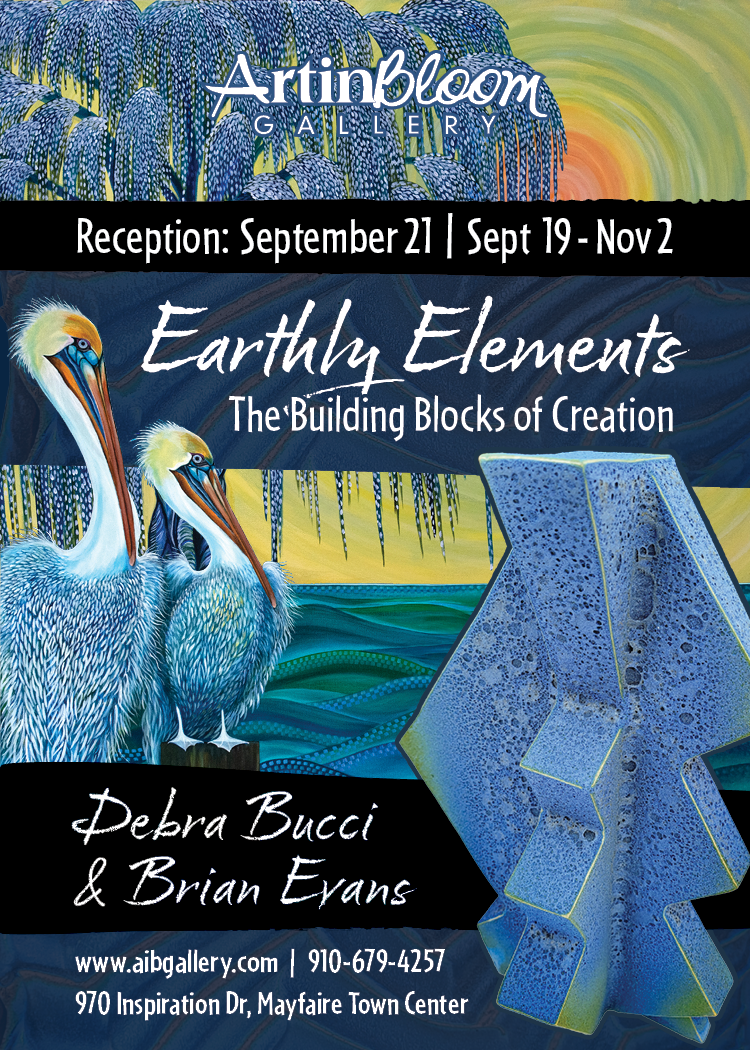 Art in Bloom Gallery is excited to pair the creations of painter Debra Bucci and ceramicist Brian Evans in their elementally inspired exhibit. After surviving an action-packed year, Debra’s newest acrylics uncover the “calm” in nature, featuring rippling waters, radiant light, and abstract textures. Meanwhile, Brian’s altered vessels emerge from nature’s fundamental building blocks. Formed from soft, wheel thrown clay, Brian’s glazes emulate the water erosion, oxidation, and scorched surfaces of nature.