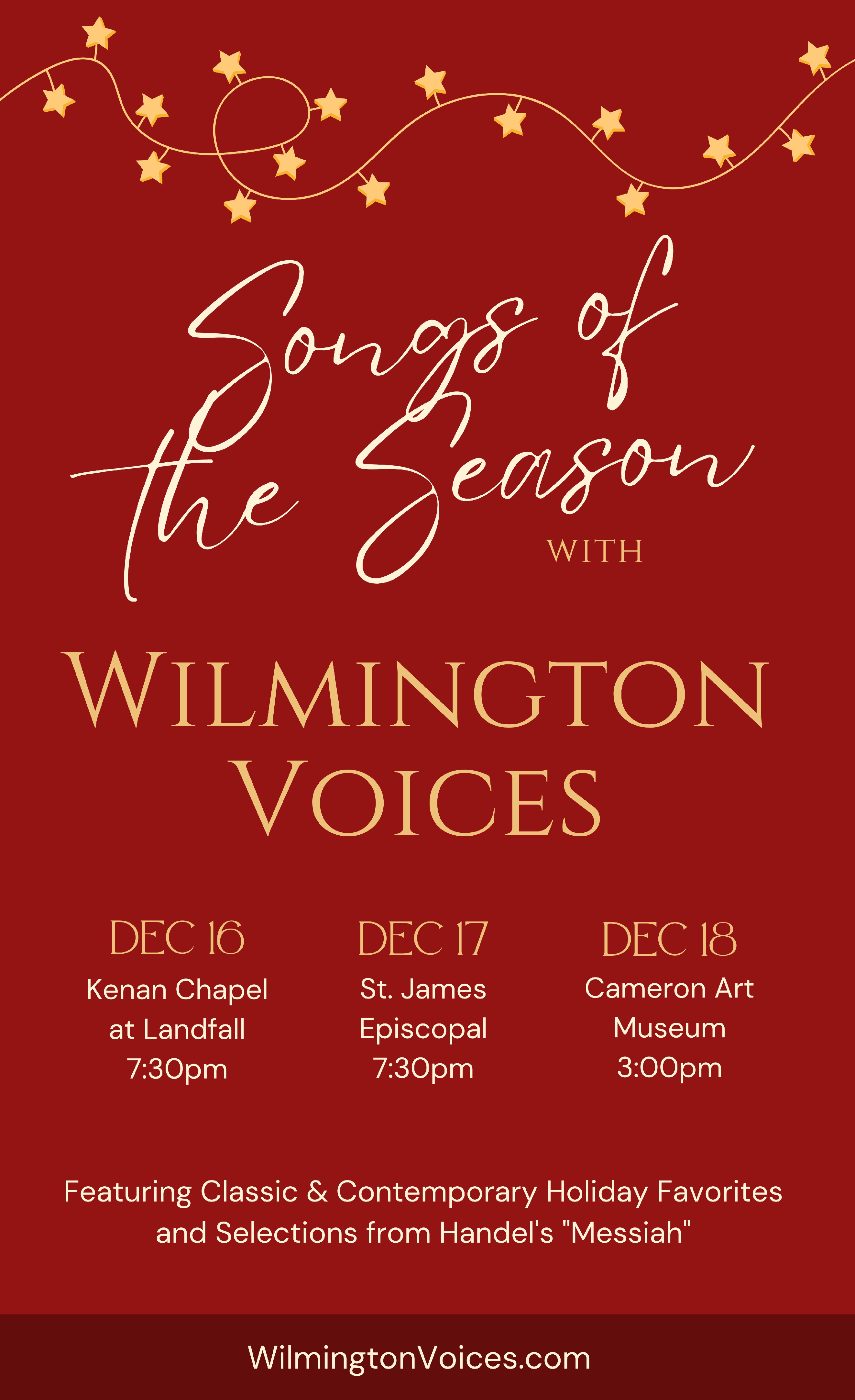We are Wilmington Voices, New Hanover County’s premiere professional vocal ensemble. Performing classical, renaissance, sacred, secular, Broadway, and popular music, Read more...