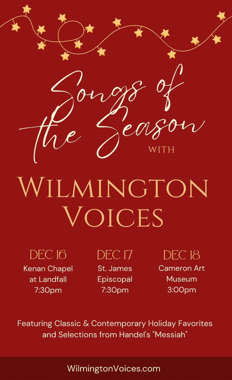 We are Wilmington Voices, New Hanover County’s premiere professional vocal ensemble. Performing classical, renaissance, sacred, secular, Broadway, and popular music, we bring musical excellence to our local community and beyond. Our approach is one of collaboration and oneness with minimal conducting and maximum communication through interpretation and body language. Join us for a concert of choral classics, musical favorites and portions of Handel’s “Messiah” this holiday season.